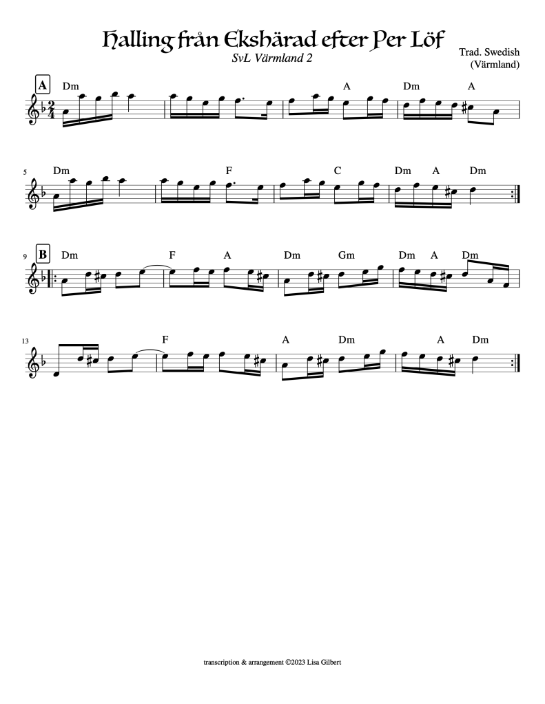This halling, collected in 1869, comes from Ekshärad. It’s an example of the cross-fertilization that often happens along borders; while hallings are most strongly associated with Norway, the Svenska Låtar books note that hallings were also popular in upper Värmland and Dalarna.