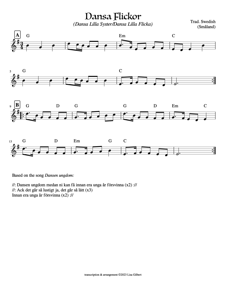 I love this tune! This slängpolska from Småland can go by many names, including Dansa Lilla Syster and Dansa Lilla Flicka.